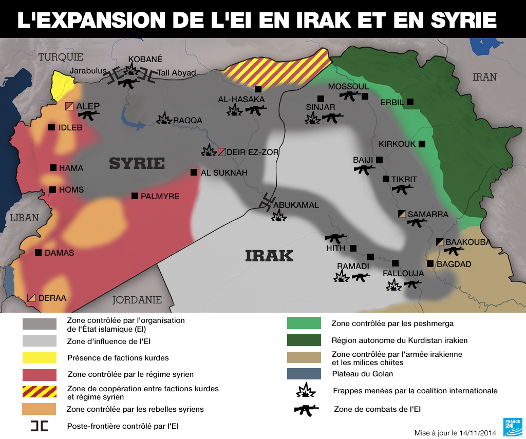 C’est en janvier 2014 que le premier coup est porté à l’autorité du gouvernement Irakien, avec la prise de Fallouja par L’État islamique en Irak et au Levant, alors branche d’Al-Qaïda depuis 2003 (dont il se sépare en 2013). Le groupe Djihadiste réussit à jumeler l’idée de rébellion contre l’état irakien « chiite » et de djihad contre l’occident. Il emporte l’adhésion d’une partie des tributs et de la population sunnite, sans oublier les anciens membres du parti Baas. Cette nouvelle organisation terroriste trouve le vivier idéal pour recruter des troupes, pas seulement aguerries, mais qui ont la volonté de se battre pour un meilleur quotidien, que n’ont pu leur offrir les américains et le gouvernement irakien. La chute de Mossoul en Juin 2014 sonne le glas de la reconstruction américaine. A côté du conflit civil irakien, l’organisation extrémiste s’est taillé un territoire en Syrie grâce à la complaisance du régime de Damas. Ce dernier utilise l’État islamique pour écraser la rébellion modérée, ce qui aboutit à la prise totale de la province de Raqqa en juin 2014, ville martyre, capitale de ce nouveau « régime ».