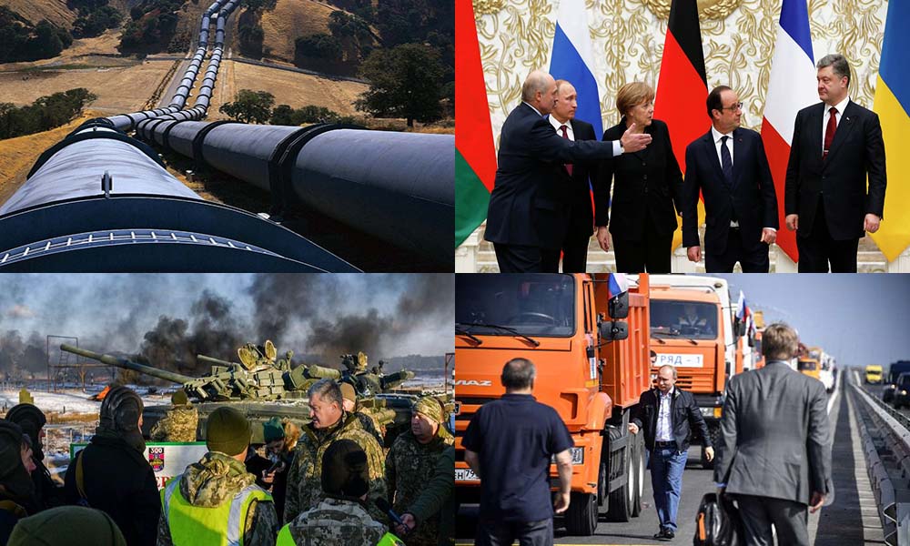 De gauche à droite, Gazoducs russes en Ukraine, rencontre de Minsk II, Le président ukrainien inspecte l’armée durant un exercice, visite de Poutine lors de l’inauguration du pont reliant la Crimée à la Russie.