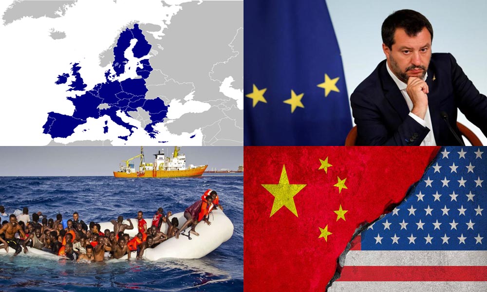 * De gauche à droite, L’Europe des 28, le ministre de l’intérieur italien Matteo Salvini, Migrants africains allant en Europe, Drapeaux Chine/USA.