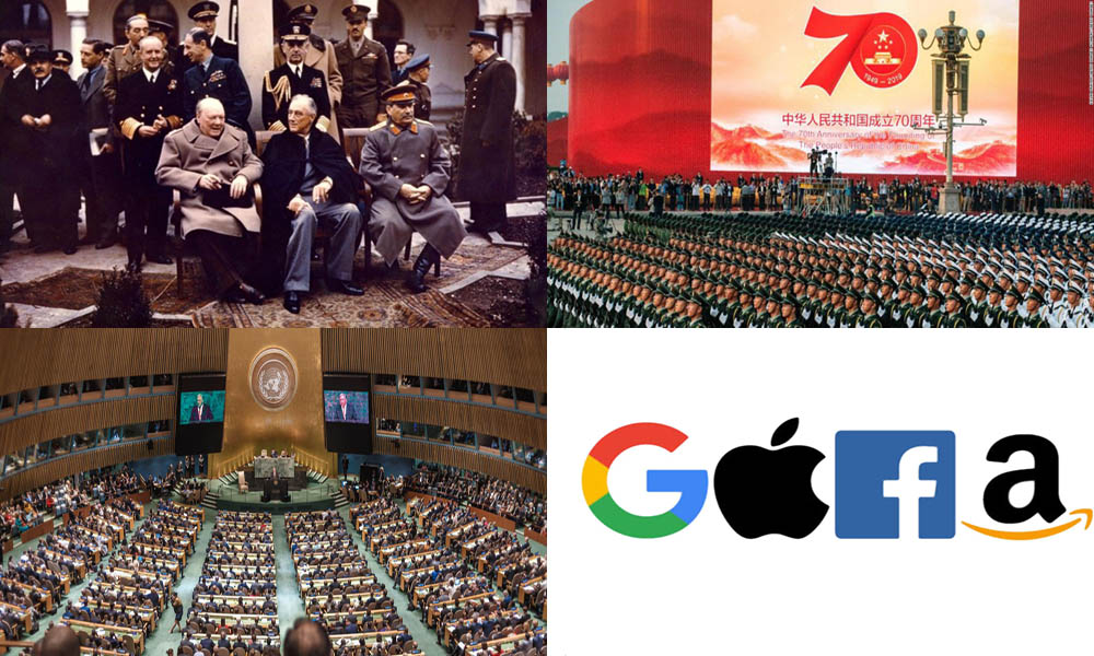 * De gauche à droite: Conférence de Yalta en 1945, 70 ans du régime communiste Chinois, Assemblée générale des Nations-Unis, et les 4 géants du Web.