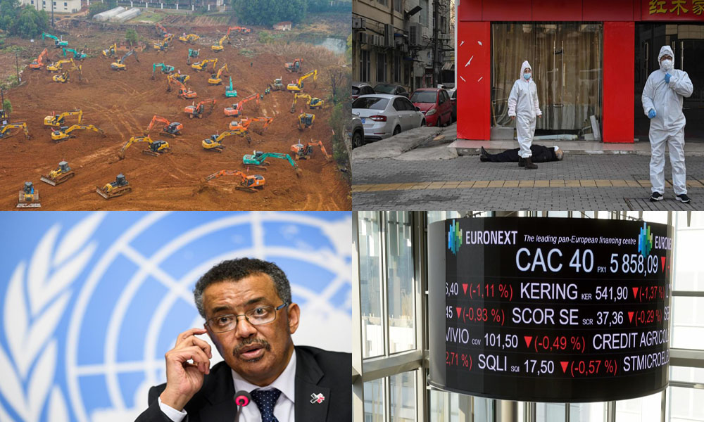 *De gauche à droite, construction en urgence d’un hôpital à Wuhan, cadavre abandonné à Wuhan, Tedros Adhanom Ghebreyesus – Directeur Général de l’OMS – et la bourse de Paris.
