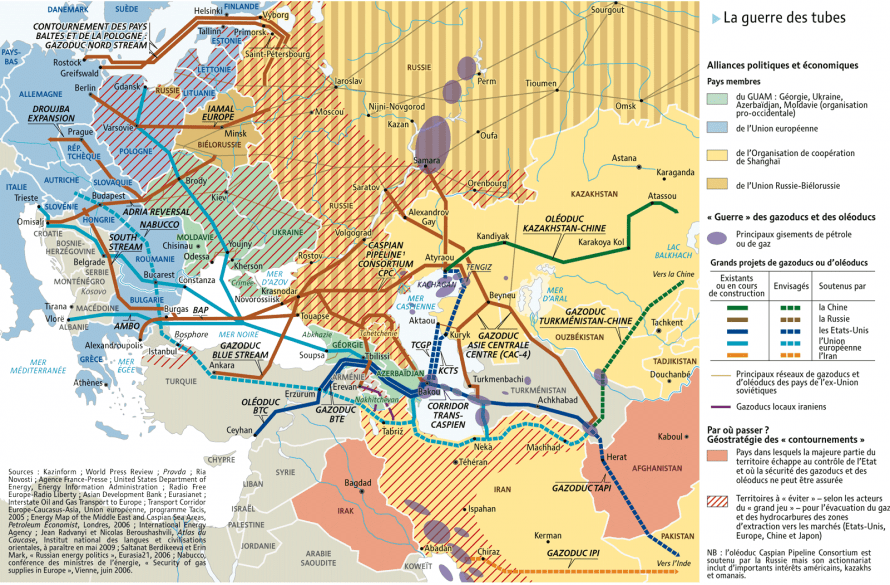 La découverte de gigantesques gisements d’hydrocarbures en mer Caspienne – à partir des années 1980 – et la chute de l’UR.S.S. bouleversèrent la géopolitique de la région. La puissance communiste ne possédait pas les fonds nécessaires pour exploiter ces richesses et interdisait toutes tentatives de pénétrations étrangères. L’implosion de l’Empire Soviétique permit l’ouverture économique des nations jouxtant la mer intérieure. La zone devient dès lors le théâtre d’une nouvelle phase du “Grand Jeu“(9). Les grandes puissances mondiales voient dans ces ressources l’occasion de se soustraire de la dépendance énergétique de la Russie et des nations arabes – entre autres -. La Chine, les U.S.A. et l’ Union Européenne pour ne citer que les plus influents se lancent dans des programmes d’approvisionnements énergétiques.